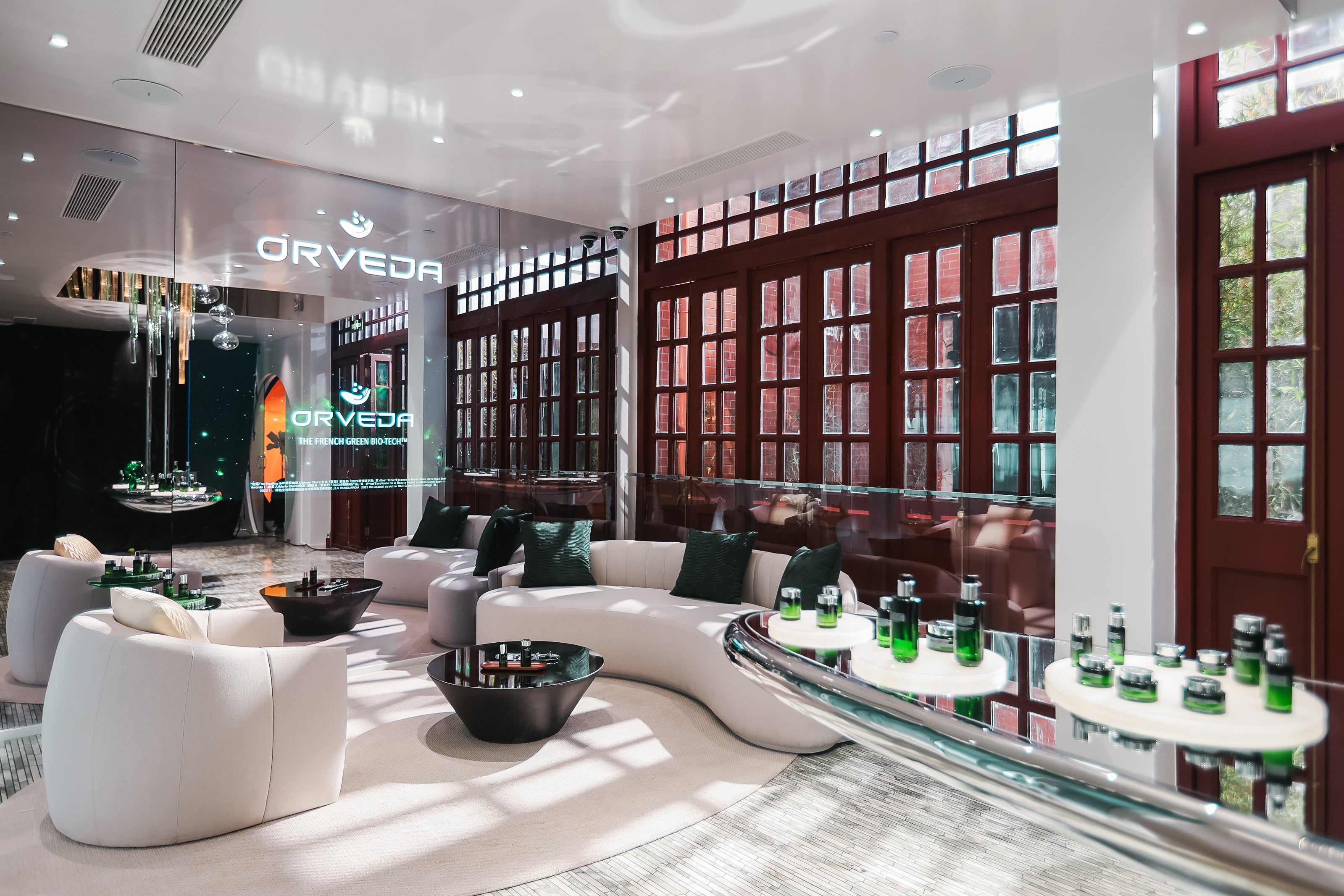 Making its debut appearance in China, Orveda is delighted and honored to open its first Maison at Capella Shanghai. Here, traditional Chinese architecture has been suffused with an air of French luxury to create a haven of tranquility in the bustling city. La Maison Orveda weaves greenery into linear forms, while a round arch at the entrance shaped like a full moon beckons guests in, letting them trace the path of green biotechnology and explore the wonders of nature. Upon entering La Maison Orveda, guests are greeted with a seamless blend of natural elements and modern technology, including a hanging display featuring seventeen newly developed products, and bands of glass resembling bamboo shoots that emit a beautifully soft glow.